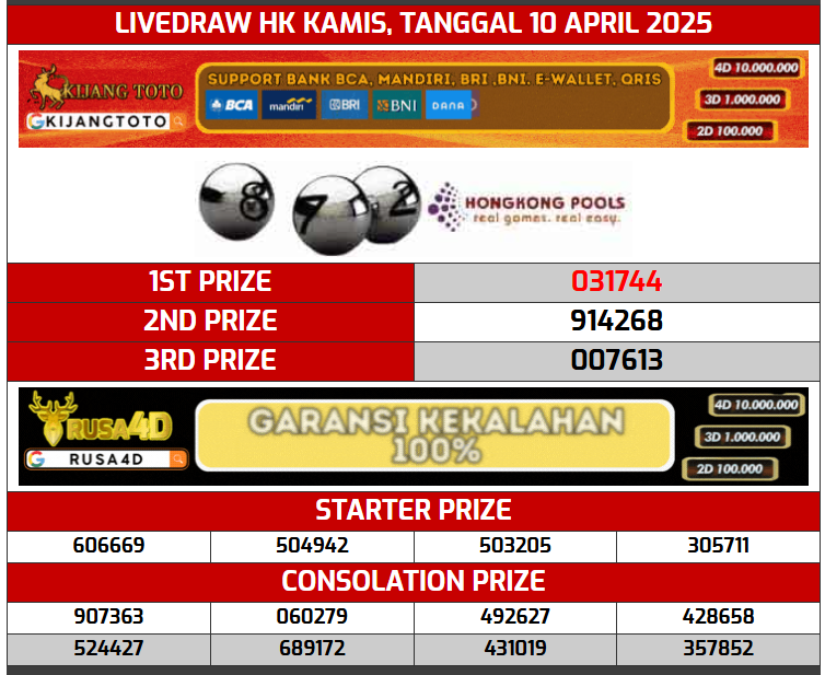 45 Result Livedraw HK Hari ini 10 April 2025 adalah istilah yang merujuk pada proses pengundian nomor secara langsung dalam permainan lotere Hongkong (HK). Livedraw HK ini biasanya disiarkan secara langsung melalui berbagai platform, termasuk situs web, media sosial, atau saluran televisi, sehingga para pemain dapat menyaksikan penarikan nomor secara real-time. Result Livedraw HK Hari ini 10 April 2025 Saksikan Live Draw SDY yang akan ditampilkan mulai pukul 22:45 WIB hingga pukul 23:05 WIB melalui tabel live sydney di bawah ini. Anda juga bisa menyaksikan Livedraw SGP dan Livedraw SDY di samping dari artikel ini : Livedraw keluaran togel Hongkong adalah siaran langsung atau penarikan langsung dari hasil undian nomor togel HK. Dalam livedraw ini, nomor yang keluar ditarik secara acak di depan kamera dan disiarkan langsung melalui internet. Tujuan dari livedraw dalam permainan togel adalah untuk memberikan transparansi dan kepercayaan kepada para pemain. Berikut beberapa tujuan utama dari livedraw: Transparansi: Dengan menyiarkan langsung proses penarikan nomor, penyelenggara togel menunjukkan bahwa hasil undian dilakukan secara acak dan jujur, tanpa adanya manipulasi. Kepercayaan: Melalui livedraw, pemain dapat melihat sendiri bagaimana nomor-nomor ditarik, sehingga meningkatkan kepercayaan mereka terhadap integritas permainan. Kepuasan Pemain: Pemain dapat mengetahui hasil undian secara real-time, tanpa harus menunggu lama. Hal ini memberikan pengalaman yang lebih interaktif dan memuaskan. Jika anda sudah selesai menyaksikan Live HK di atas anda bisa melihat juga data HK yang kami siapkan dibawah ini. Data Result HK menampilkan hasil keluaran Hongkong. Kegunaan Data HK ini untuk memudahkan anda dalam memilih atau menciptakan angka prediksi yang akan muncul di periode selanjutnya. Di samping tabel data , anda juga dapat memprediksi angka keluaran melalui PAITO HK .