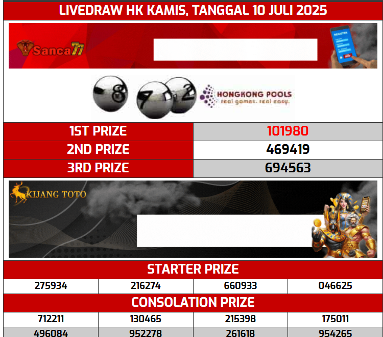 25 Result Livedraw HK Hari ini 10 Juli 2025 adalah istilah yang merujuk pada proses pengundian nomor secara langsung dalam permainan lotere Hongkong (HK). Livedraw HK ini biasanya disiarkan secara langsung melalui berbagai platform, termasuk situs web, media sosial, atau saluran televisi, sehingga para pemain dapat menyaksikan penarikan nomor secara real-time. Result Livedraw HK Hari ini 10 Juli 2025 Saksikan Live Draw SDY yang akan ditampilkan mulai pukul 22:45 WIB hingga pukul 23:05 WIB melalui tabel live sydney di bawah ini. Anda juga bisa menyaksikan Livedraw SGP dan Livedraw SDY di samping dari artikel ini : Livedraw keluaran togel Hongkong adalah siaran langsung atau penarikan langsung dari hasil undian nomor togel HK. Dalam livedraw ini, nomor yang keluar ditarik secara acak di depan kamera dan disiarkan langsung melalui internet. Tujuan dari livedraw dalam permainan togel adalah untuk memberikan transparansi dan kepercayaan kepada para pemain. Berikut beberapa tujuan utama dari livedraw: Transparansi: Dengan menyiarkan langsung proses penarikan nomor, penyelenggara togel menunjukkan bahwa hasil undian dilakukan secara acak dan jujur, tanpa adanya manipulasi. Kepercayaan: Melalui livedraw, pemain dapat melihat sendiri bagaimana nomor-nomor ditarik, sehingga meningkatkan kepercayaan mereka terhadap integritas permainan. Kepuasan Pemain: Pemain dapat mengetahui hasil undian secara real-time, tanpa harus menunggu lama. Hal ini memberikan pengalaman yang lebih interaktif dan memuaskan. Jika anda sudah selesai menyaksikan Live HK di atas anda bisa melihat juga data HK yang kami siapkan dibawah ini. Data Result HK menampilkan hasil keluaran Hongkong. Kegunaan Data HK ini untuk memudahkan anda dalam memilih atau menciptakan angka prediksi yang akan muncul di periode selanjutnya. Di samping tabel data , anda juga dapat memprediksi angka keluaran melalui PAITO HK .