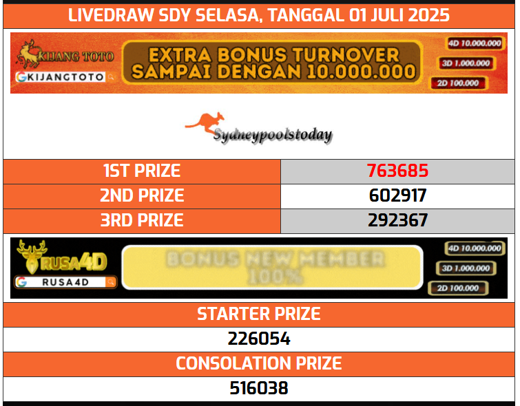 28 Result Livedraw SDY Hari ini 1 Juli 2025 adalah istilah yang merujuk pada proses pengundian nomor secara langsung dalam permainan lotere Sydney (SDY). Livedraw SDY ini biasanya disiarkan secara langsung melalui berbagai platform, termasuk situs web, media sosial, atau saluran televisi, sehingga para pemain dapat menyaksikan penarikan nomor secara real-time. Result Livedraw SDY Hari ini 1 Juli 2025 Saksikan Live Draw SDY yang akan ditampilkan mulai pukul 13:35 WIB hingga pukul 13:55 WIB melalui tabel live sydney di bawah ini. Anda juga bisa menyaksikan Livedraw SGP dan Livedraw HK di samping dari artikel ini : Livedraw keluaran togel Sydney adalah siaran langsung atau penarikan langsung dari hasil undian nomor togel SDY . Dalam livedraw ini, nomor yang keluar ditarik secara acak di depan kamera dan disiarkan langsung melalui internet. Tujuan dari livedraw dalam permainan togel adalah untuk memberikan transparansi dan kepercayaan kepada para pemain. Berikut beberapa tujuan utama dari livedraw: Transparansi: Dengan menyiarkan langsung proses penarikan nomor, penyelenggara togel menunjukkan bahwa hasil undian dilakukan secara acak dan jujur, tanpa adanya manipulasi. Kepercayaan: Melalui livedraw, pemain dapat melihat sendiri bagaimana nomor-nomor ditarik, sehingga meningkatkan kepercayaan mereka terhadap integritas permainan. Kepuasan Pemain: Pemain dapat mengetahui hasil undian secara real-time, tanpa harus menunggu lama. Hal ini memberikan pengalaman yang lebih interaktif dan memuaskan. Jika anda sudah selesai menyaksikan Live SDY di atas anda bisa melihat juga data SDY yang kami siapkan dibawah ini. Data Result SDY menampilkan hasil keluaran Sydney. Kegunaan Data Sdy ini untuk memudahkan anda dalam memilih atau menciptakan angka prediksi yang akan muncul di periode selanjutnya. Di samping tabel data , anda juga dapat memprediksi angka keluaran melalui PAITO SDY .