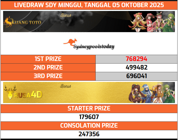 7 Result Livedraw SDY Hari ini Livedraw SDY Hari ini 4 Oktober 2025 adalah istilah yang merujuk pada proses pengundian nomor secara langsung dalam permainan lotere Sydney (SDY). Livedraw SDY ini biasanya disiarkan secara langsung melalui berbagai platform, termasuk situs web, media sosial, atau saluran televisi, sehingga para pemain dapat menyaksikan penarikan nomor secara real-time. Result Livedraw SDY Hari ini Livedraw SDY Hari ini 4 Oktober 2025 Saksikan Live Draw SDY yang akan ditampilkan mulai pukul 13:35 WIB hingga pukul 13:55 WIB melalui tabel live sydney di bawah ini. Anda juga bisa menyaksikan Livedraw SGP dan Livedraw HK di samping dari artikel ini : Livedraw keluaran togel Sydney adalah siaran langsung atau penarikan langsung dari hasil undian nomor togel SDY . Dalam livedraw ini, nomor yang keluar ditarik secara acak di depan kamera dan disiarkan langsung melalui internet. Tujuan dari livedraw dalam permainan togel adalah untuk memberikan transparansi dan kepercayaan kepada para pemain. Berikut beberapa tujuan utama dari livedraw: Transparansi: Dengan menyiarkan langsung proses penarikan nomor, penyelenggara togel menunjukkan bahwa hasil undian dilakukan secara acak dan jujur, tanpa adanya manipulasi. Kepercayaan: Melalui livedraw, pemain dapat melihat sendiri bagaimana nomor-nomor ditarik, sehingga meningkatkan kepercayaan mereka terhadap integritas permainan. Kepuasan Pemain: Pemain dapat mengetahui hasil undian secara real-time, tanpa harus menunggu lama. Hal ini memberikan pengalaman yang lebih interaktif dan memuaskan. Jika anda sudah selesai menyaksikan Live SDY di atas anda bisa melihat juga data SDY yang kami siapkan dibawah ini. Data Result SDY menampilkan hasil keluaran Sydney. Kegunaan Data Sdy ini untuk memudahkan anda dalam memilih atau menciptakan angka prediksi yang akan muncul di periode selanjutnya. Di samping tabel data , anda juga dapat memprediksi angka keluaran melalui PAITO SDY .